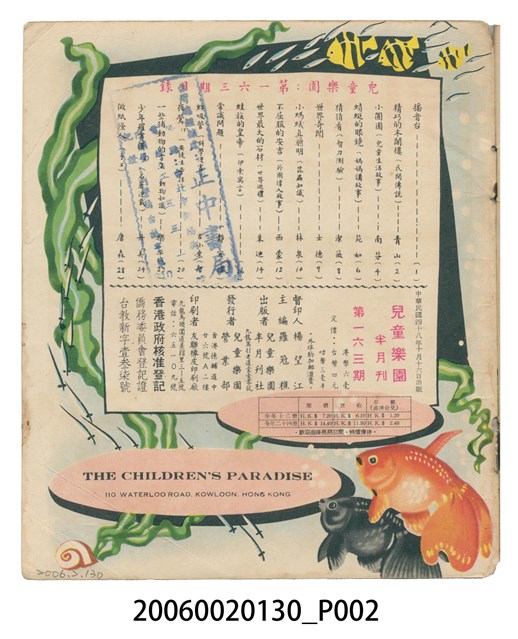 1.本件為《兒童樂園》第163期,彩色印刷,內容有民間傳說、兒童生活故事、媽媽講故事、昆蟲知識、外國偉人故事、世界巡禮、伊索寓言等等。2.《兒童樂園》創刊於1953年1月,至1995年因為經濟問題停刊,於香港共出版1006期的兒童半月刊。全書彩色印刷,內容包含歷史故事、世界童話等等,取材新穎、內容健康。53年至1995年於香港共出版1006期的兒童半月刊。