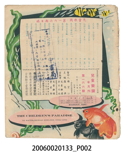 楊望江督印、羅冠樵主編、兒童樂園半月刊社出版、兒童樂園營業部發行、友聯橡皮印刷廠印刷