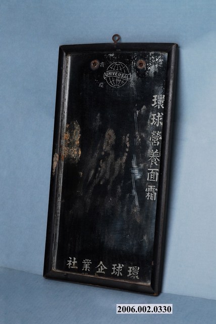 1.本件環球企業社贈壁掛儀容鏡作直式長方形鏡面,呈長22.5公分,寬44.3公分,高1.7公分。鏡框採木材製作成條框樣式,外面塗佈黑漆,鏡面以玻璃製作,背面以木板作襯,儀容鏡頂端固定有金屬圓還可作吊掛使用。鏡面上端中央處印有圓球形表面帶有經緯線之地球儀樣式,中段覆有飄帶式框線,內印「UNIVERSAL」,其地球儀四周印有「註冊商標」。鏡面右側邊直書「環球影養面霜」,底端面橫書「環球企業社」字樣。2.本件木框鏡採壁掛方式置於居家或店面出入頻繁的地方,作整理儀容時使用。儀容鏡為商品贈送品或商家公關禮品,於鏡面印有商標與商品名稱,可達到廣告效果。