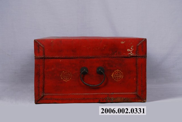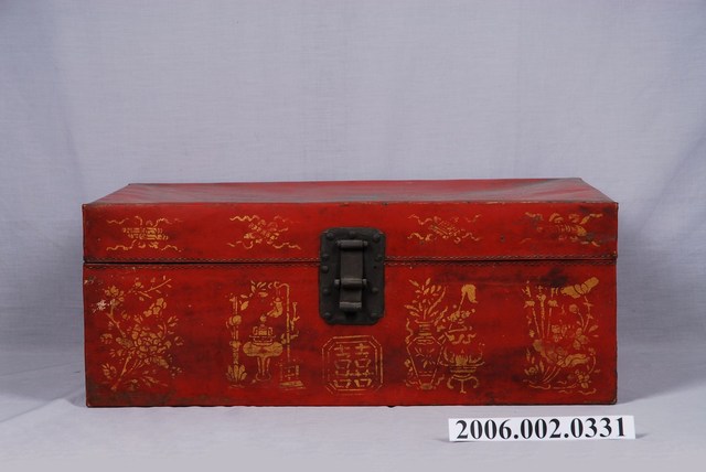 1.本藏品為朱漆皮箱,長68.5公分,寬46.1公分,高26公分。整體成方形,通體施以紅漆,上蓋與下箱之間有金屬鎖扣,兩側翼有圓形金屬手把。箱蓋正面以金漆描繪了琴棋書畫四個吉祥圖案,箱體在鎖扣下方則同樣以金漆繪有帶框雙喜,兩側則有牡丹、香爐、花瓶、蓮花等吉祥圖案。側面拉把兩側,則有壽字圖案。