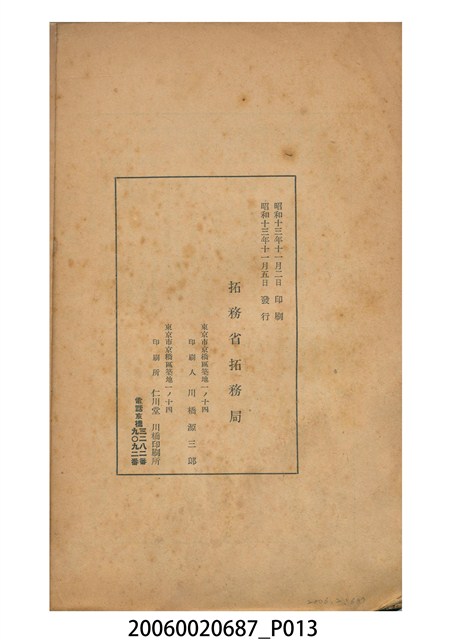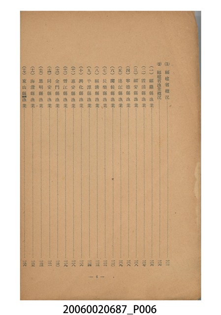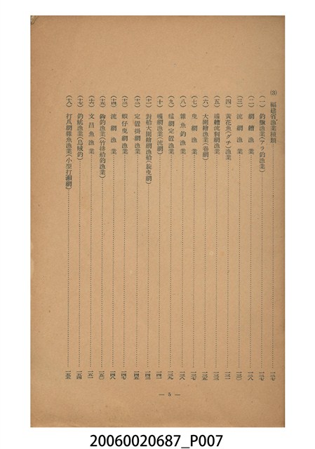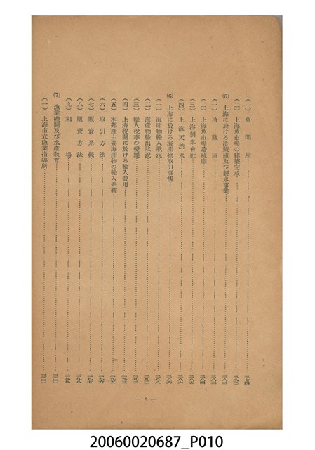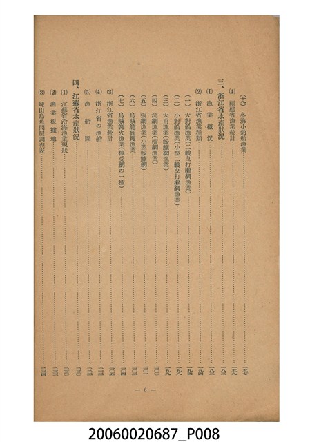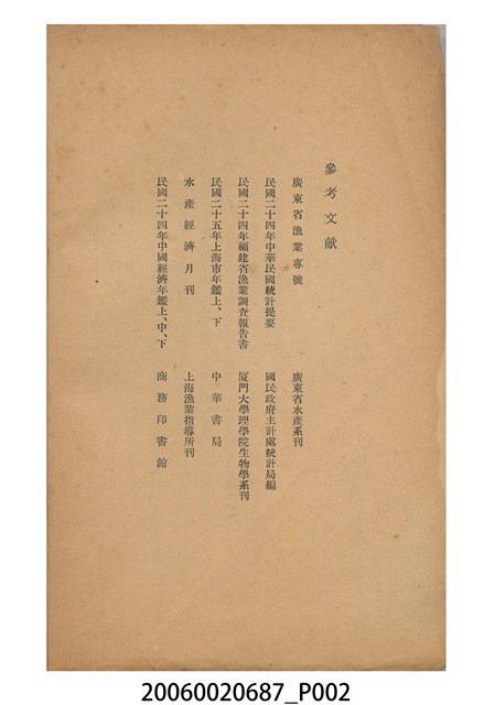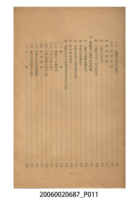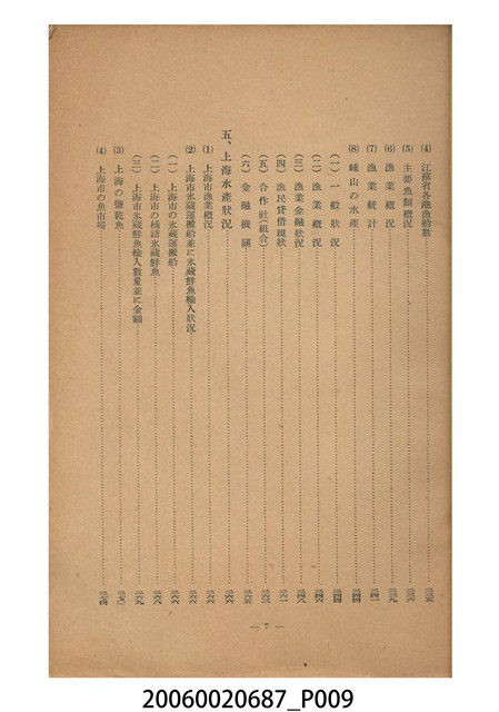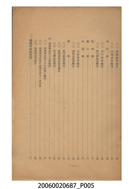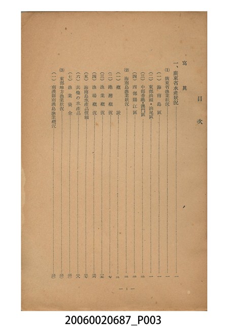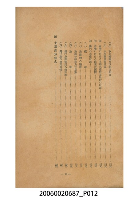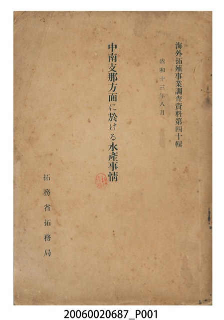 本物件為中國中南部的水產情況,書原名為「中南支那に於ける水產事情」,為拓務省拓務局的海外拓殖事業調查資料系列中的第四十輯,於昭和13年11月5日發行,內容可見分成中國各省分的漁業資源作介紹,包含廣東省、福建省、浙江省、江蘇省、上海、香港及澳門地區等等,附件則列出中國漁產分類及名稱。