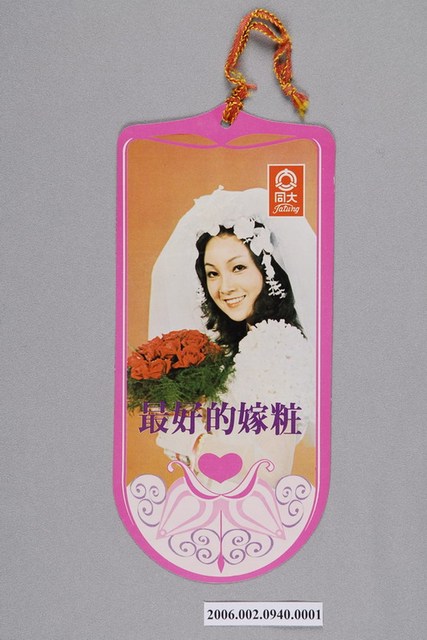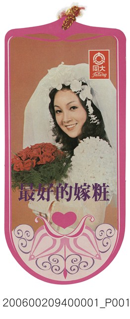 1.本物件為大同公司廣告單,為大件式,紙製材質。廣告單上方有一圓孔,繫以一紅黃相間的繩子。廣告單主視覺為一穿著白紗、手持捧花的年輕女性。廣告單中央有一標題「最好的嫁妝」;右上方有大同公司商標。