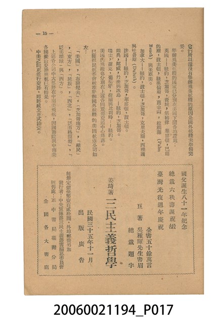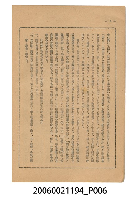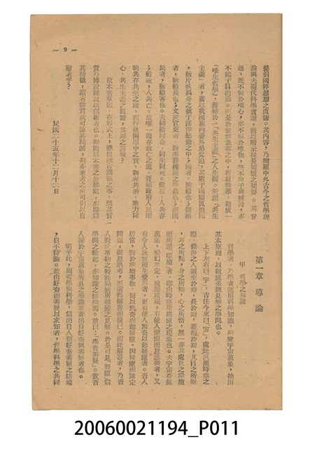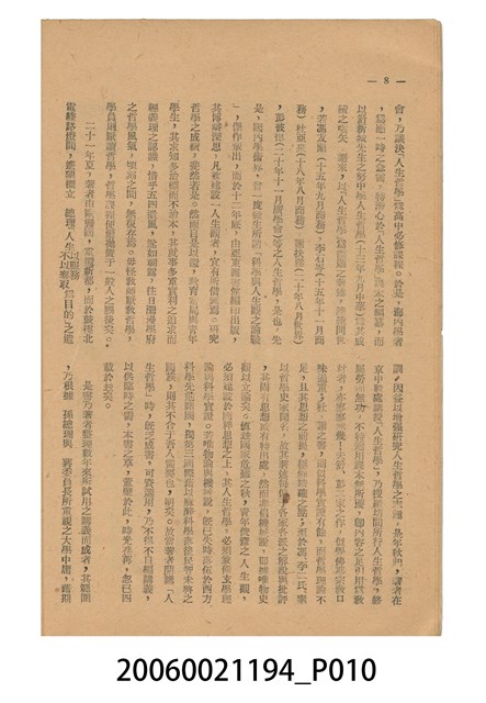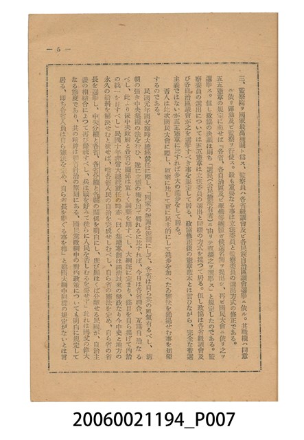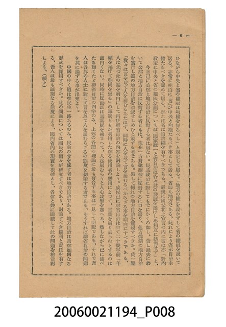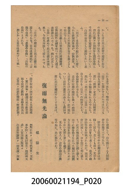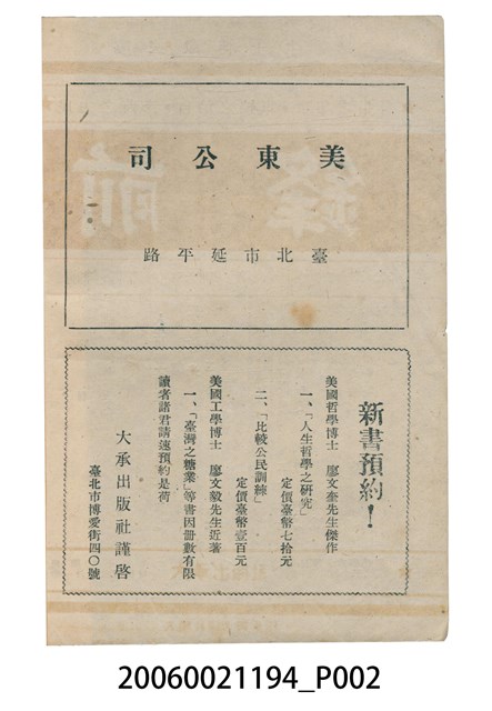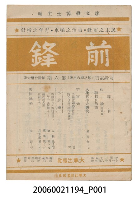 此為一紙質雜誌,此書為大承出版社於1946年(民國35年)11月16日出版的《前鋒叢書》第6期。 本物件為1946年創辦的《前鋒》叢書,創辦人為廖文毅,廖文毅為臺灣獨立運動的先驅。在1945年二次世界大戰結束後,廖文毅在臺灣創立「臺灣民族精神振興會」,同年又創辦「臺灣憲政會」並在翌年創辦《前鋒》雜誌,內容為關於政治、社會、經濟、文化的評論雜誌。同年廖文毅以「聯省自治」的主張,強調各省高度自治,組成聯邦體制,但最終落選,在1947年爆發二二八事件後,人在上海的廖文毅對中華民國政府從期待轉為絕望,因而開始創辦臺獨組織且成為臺獨運動的先鋒之一。 《前鋒》雜誌創辦於戰後初期,此時期出版法規的鬆綁促使臺灣的雜誌大量創辦,然而1946年行政長官公署下令禁止使用日文,使雜誌受到語文限制的打擊,更於1947年發生二二八事件,大量的雜誌遭到查禁,其後僅有官方雜誌以及受到官方贊助的雜誌得以存活,物價的飆漲更進一步限制雜誌的生存。在1949年戒嚴之後,言論自由受到限制,民間雜誌更受到影響,知識分子僅能從文藝、人文思想方面尋找出口,形成1950至1960年代文藝雜誌大量出現的狀況。