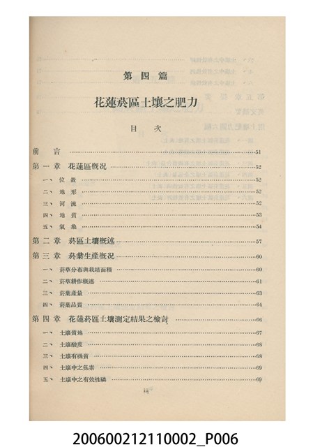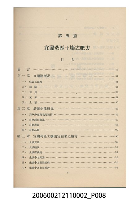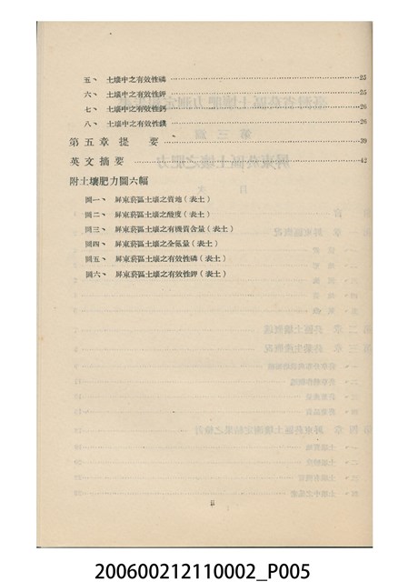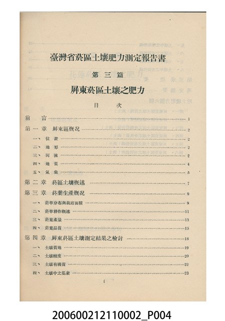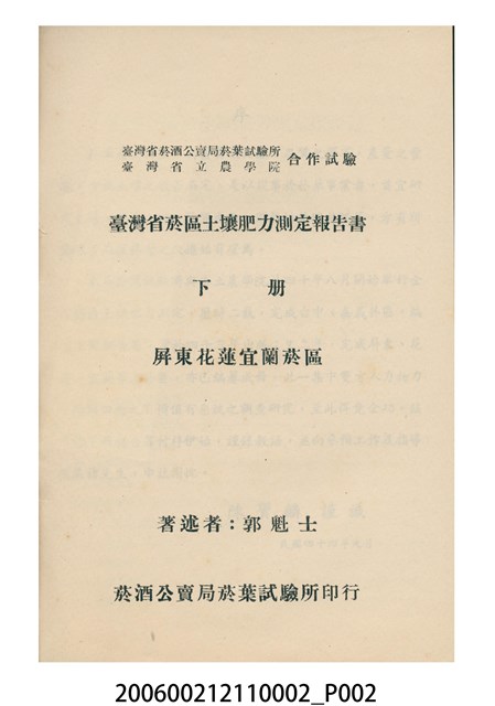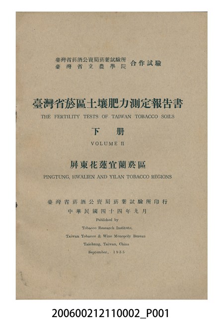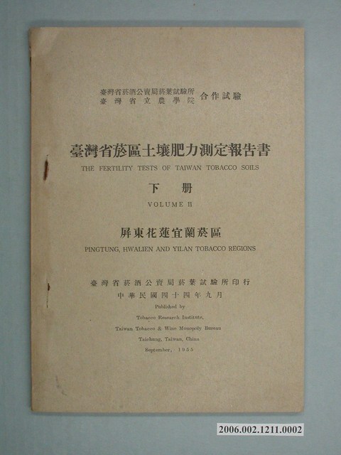 1.本物件為臺灣省菸酒公賣局菸葉試驗所印行《臺灣省菸區土壤肥力測定報告書》下冊,為紙質,封面有「臺灣省菸酒公賣局菸葉試驗所 臺灣省立農學院 合作試驗」、「臺灣省菸區土壤肥力測定報告書」、「THE FERTILITY TESTS OF TAIWAN TOBACCO SOILS」、「下冊」、「VOLUME Ⅱ」、「屏東花蓮宜蘭菸區」、「PINGTUNG, HWALINE AND YILAN TOBACCO REGIONS」、「臺灣省菸酒公賣局菸葉試驗所印行」、「中華民國四十四年九月」、「Published by Tobacco Research Institute,」、「Taiwan Tobacco & Wine Monopoly Bureau」、「Taichung, Taiwan, China」、「September, 1955」黑色字樣,封底無圖案字樣,本書之著述者為郭魁士,其內容大致分為屏東菸區、花蓮菸區與宜蘭菸區,介紹3區概況、土壤概述、菸葉生產概況、土壤之採集與測定、測定結果之檢討,並附有土壤肥力圖及英文摘要。
