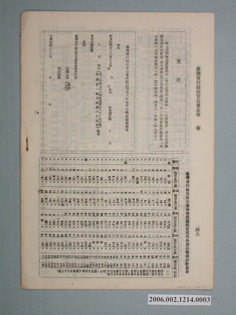 此為一紙質期刊,封面右側標示期刊名稱,左側為目錄。此為1947年1月7日發行之《臺灣省行政長官公署公報》春字第33-48頁,內容計有:(一)法令類、(1)中央∕〈營業牌照稅法(續)〉、〈土地重劃辦法(續)〉、〈查禁民間不良習俗辦法〉、(2)本省∕〈臺灣省各縣市政府辦理土地權利公告辦法(續)〉、〈臺灣省各鄉鎮帳務查核辦法〉、〈臺灣鐵路管理委員會廣告管理規則〉;(二)命令類、(1)任免令∕〈臺灣省行政長官公署派免人員一覽表〉、(2)通緝令∕〈通緝楊太山等十二名〉;(三)政令主管類、(1)民政處∕〈電各縣市政府為轉發查禁民間不良習俗辦法希遵照〉、〈電各縣市政府為清查戶口整頓保甲係卅六年度共同性中心工作轉希遵照〉、〈電各縣市政府為曾任偽職未判罪者在二年內亦不得為公職候選人轉希知照〉、〈電復嘉義市政府參議會秘書等人員資格審查及考成適用聘派人員管理條例辦理〉、〈電復新竹市政府凡貧苦精神病等患者如有合法證明各療養院可免費治療〉、〈電臺北等縣市政府為復興茶園貸款應簡化手續希知照〉、(2)財政處∕〈電為縣市參議會議決之預算應由省核定希查照〉、〈電各縣市政府派員來處具領契紙〉、〈電復高雄縣第一稅務稽徵所官署以外團體所出服務證書應比照稅表第三十一目例貼花〉、(3)農林處∕〈電新竹等縣合作社聯合社為復興茶園貸款准在貸出時一次貼足印花希查照〉、(4)交通處∕〈電公路局為汽車違章處罰辦法應據修正汽車管理規則第七十一條規定辦理轉希知照〉、〈電各縣市政府為臨時行車執照有效期限展延至本月底止希轉飭知照〉、(5)警務處∕〈表復新竹市政府人犯名籍登記表應改正各點〉、(6)會計處∕〈電各縣政府為訂頒本省各鄉鎮帳務查核辦法希轉飭遵照〉、〈電復臺中市政府現金出納事務應由市長就秘書室總務科中指定人員辦理〉;(四)附錄類、(1)通訊∕〈臺灣省行政長官公署及其他各機關電話號碼表〉(續)等。 臺灣省行政長官公署於1945年9月1日在重慶成立,以陳儀為行政長官,是國民黨政府在戰後為了接收臺灣以及海南諸島所設置的特殊行政組織。長官公署內部派系林立、官員素質良莠不齊,因而在接收後,臺灣物價飆漲、物資稀缺、治安紊亂(游維真,2006:25-63)最終在1947年爆發「二二八事件」,事件之後,臺灣省行政長官公署改組為臺灣省政府。而行政長官陳儀於1948年被改任命為浙江省政府主席,但在1949年因匪諜案被判處死刑,於臺北槍決。