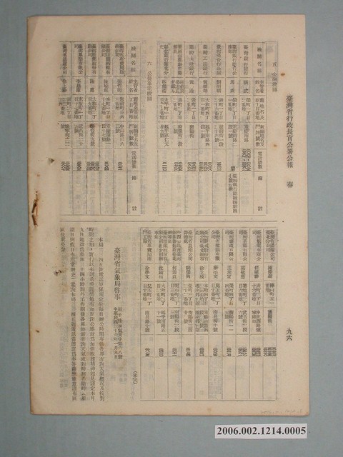 此為一紙質期刊,封面右側標示期刊名稱,左側為目錄。此為1947年1月10日發行之《臺灣省行政長官公署公報》春字第81-96頁,內容計有:(一)法令類、(1)中央∕〈修正進出口貿易暫行辦法〉、〈地方救濟協會實施辦法〉、〈獎勵醫藥技術條例施行細則〉、〈行政院令為非軍事機關學校人員一律不得著用軍人同樣式制式服裝〉(2)本省∕〈臺灣省行政長官公署民政處地政局組織規程〉、〈臺灣省縣市各級辦理戶籍登記辦法(續)〉、〈臺灣省植物輸出輸入取締規則〉、〈臺灣省特殊植物輸入取締規則〉;(二)命令類、(1)任免令∕〈臺灣省行政長官公署派免人員一覽表〉、(2)嘉獎令∕〈臺灣省行政長官公署獎勵人員一覽表〉、(3)懲戒令∕〈臺灣省行政長官公署懲戒人員一覽表〉、(4)通緝令∕〈通緝黃元欽〉、〈撤銷賴添讚通緝令〉;(三)政令主管類、(1)民政處∕〈電各縣市政府為轉發地方救濟協會實施辦法希知照〉、〈電各縣市政府填報外國教會概況調查表〉、〈電各縣市政府按期編報出生死亡等戶籍統計表〉、〈電復新竹市政府辦理風災賑濟應填具印領報備〉、(2)財政處∕〈電復屏東市政府財政科財產股執掌疑義各點希查照〉、(3)農林處∕〈電各縣市政府為奉令魚稅漁業稅應一律豁免轉希知照〉、(4)會計處∕〈電為各機關會計人員不得兼管出納或經理財物事務希遵照〉、(5)糧食局∕〈電發本局各事務所破獲違反糧食管理案件報告書格式希仿製應用〉;(四)附錄類∕(1)通報、〈臺灣省氣象局通報各機關為授時電話自本月九日起改為整天廿四小時服務請查照〉、〈臺灣省地質調查所通報遷移辦公地址〉、(2)通訊、〈臺北市各機關學校社團現在地址一覽表(續)〉、〈臺灣省氣象局二三四五授時電話改為整日服務啟事〉等。 臺灣省行政長官公署於1945年9月1日在重慶成立,以陳儀為行政長官,是國民黨政府在戰後為了接收臺灣以及海南諸島所設置的特殊行政組織。長官公署內部派系林立、官員素質良莠不齊,因而在接收後,臺灣物價飆漲、物資稀缺、治安紊亂(游維真,2006:25-63)最終在1947年爆發「二二八事件」,事件之後,臺灣省行政長官公署改組為臺灣省政府。而行政長官陳儀於1948年被改任命為浙江省政府主席,但在1949年因匪諜案被判處死刑,於臺北槍決。