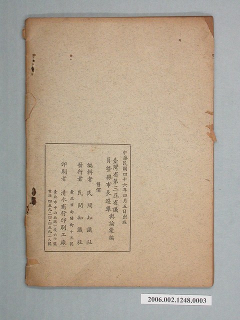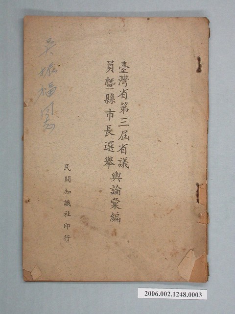 2006.002.1248.0003 民間知識社印行《臺灣省第三屆省議員暨縣市長選舉輿論彙編》