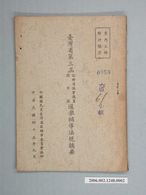 此物件為《臺灣省第三屆臨時省議會議員、縣市長選舉輔導法規摘要》,印行單位為中國國民黨臺灣省高雄市委員會。此物件所對應的具體事件為1957年4月舉行的中華民國臺灣省第三屆臨時省議會議員暨縣市長選舉。 臺灣省議會的前身為「臺灣省參議會」,成立於1946年,其成員係由各縣市參議員依照人口比例選出。在1947年「二二八事件」後,臺灣省參議會的代議功能受限,不久即式微。在1949年國民黨政府遷臺後,為了避免中央政府與臺灣省政府因設於同一所在地發生的各種問題,於是將省政府遷往南投並設立「臨時省議會」。1957年的第三屆臨時省議會選舉,是首度以直選形式進行的省議員選舉。1959年,「臨時省議會」改為「省議會」,此時的臺灣省議會成為臺灣最高民意機關,針對臺灣省政府的行政與政策進行監督及質詢。1997年「精省」案後,臺灣省議會更名為「臺灣省諮議會」,主要工作轉為歷史文獻之保存。(臺灣省諮議會,2014:4-37) 另外臺灣縣市長選舉之實施始於1950年(民國39年),由時任省政府主席的吳國楨推動,依據「臺灣省各縣市實施地方自治綱要」,在1950至1951年間於臺灣省各地舉行投票。縣市長民選之型態,在1960至1980年代之間曾經歷一段調整期。由於臺北市及高雄市在1967、1979年分別「升格」為院轄市,在院轄市相關選舉法規尚未制訂、頒布前,北、高兩市市長皆由官方派任。1994年「直轄市自治法」正式頒布,北、高兩市市長改為民選,地方自治之工程方告完備。