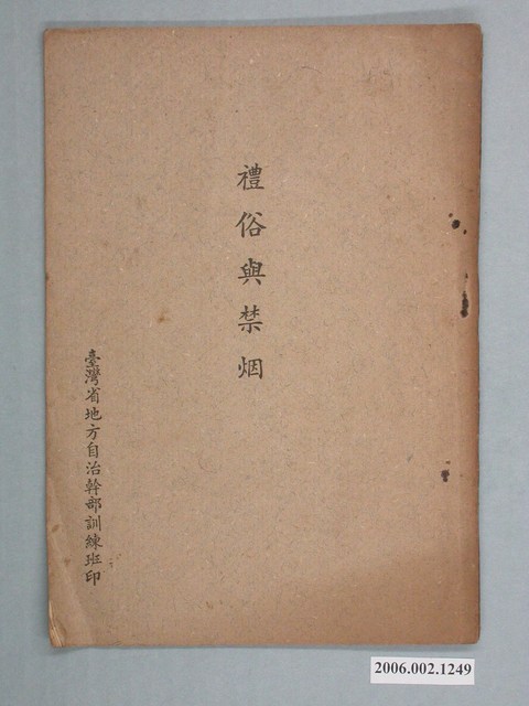 1.本物件為臺灣省地方自治幹部訓練班印《禮俗與禁烟》,為紙質,封面有「禮俗與禁烟」、「臺灣省地方自治幹部訓練班印」黑色字樣,背面無圖案與字樣,內容分為禮俗與禁菸2種,禮俗部分有典禮祀祠、宗教管理、褒卹獎勳與改善民俗,禁菸部分有我國禁菸簡史、本省禁政措施、肅清菸毒條例與查禁菸毒之獎懲。