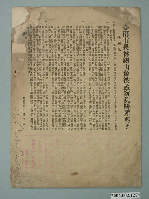 此物件為政治宣傳小冊,標題為〈南市長林錫山真面目〉,編著者為翁正義,出版日期為1971年1月1日。 本件所提及的候選人林錫山,出身臺南鹽埕政商世家,曾於1968至1973年間擔任臺南市市長。1970年,林錫山因市議員蘇南成的舉發,被檢方以涉嫌收賄為由偵訊,但未遭起訴。 臺灣縣市長選舉之實施始於1950年(民國39年),由時任省政府主席的吳國楨推動,依據「臺灣省各縣市實施地方自治綱要」,在1950至1951年間於臺灣省各地舉行投票。縣市長民選之型態,在1960至1980年代之間曾經歷一段調整期。由於臺北市及高雄市在1967、1979年分別「升格」為院轄市,在院轄市相關選舉法規尚未制訂、頒布前,北、高兩市市長皆由官方派任。1994年「直轄市自治法」正式頒布,北、高兩市市長改為民選,地方自治之工程方告完備。