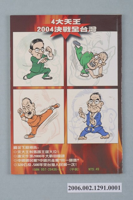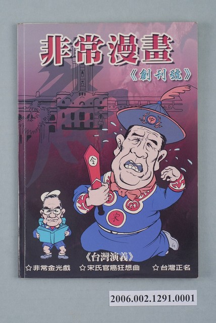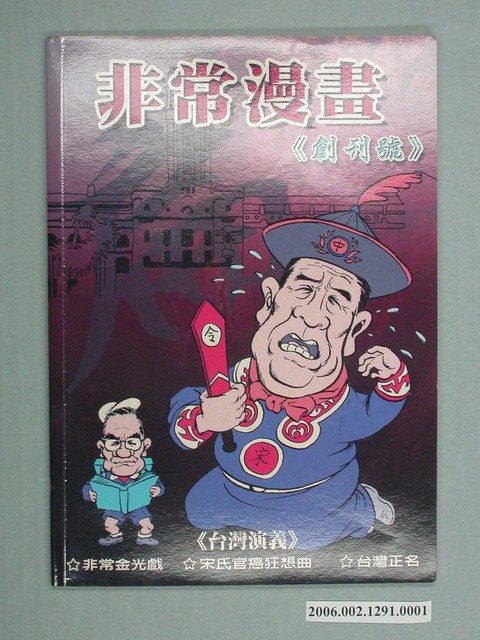 此為政治漫畫,題名為《非常漫畫》創刊號,副標題為「臺灣演義」,收錄篇目有「非常金光戲」、「宋氏官癌狂想曲」、「臺灣正名」等,封底印有下期預告,標題為「4大天王2004決戰全臺灣」,收錄篇目有「宋大王射馬踢王謀大位!」、「連宋作堆2000年大戰回憶錄」、「中國國民黨?中國共產黨?同一國嗎?」、「320公投 500年來臺灣人民第一次!」等。 此物件為2004年第11屆總統選舉的相關產物,此次選舉中,由兩組人馬競爭總統,分別為中國國民黨與親民黨共同派出的連戰、宋楚瑜,以及民主進步黨派出的陳水扁、呂秀蓮,選舉結果由陳水扁、呂秀蓮以極小的差距連任成功。由於雙方得票數過於逼近,造成支持群眾的抗議與警民衝突,連戰、宋楚瑜陣營也提出重新驗票的要求,但未能改變選舉結果。(張佑宗。2006:128-133。)
