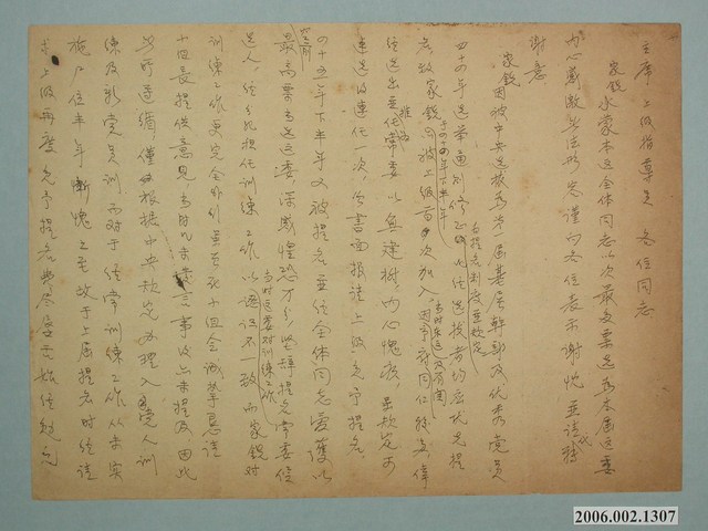 此物件為公文,名目為「中國國民黨臺灣省臺中市委員會代電」,發佈者為代主任委員邱欽洲,發佈日期為1956年7月17日。內容標題為「中國國民黨黨員參加改進水利會會長評議會常委提名候選人登記須知」。物件背面留有大量手寫字跡,內容為書信。 此公文中所提及的水利會,是中華民國政府在1945年後將日治時期全臺各地「水利組合」加以整合改組而成的機構,全名為農田水利會。水利會長期與政治利益相關聯,在2018年起,民進黨政府推動修法將水利會改制為公務機關,相關作業將受《公務人員行政中立法》規範。 中國國民黨在臺灣之統治,始於二戰後的接收時期。1945年日本於太平洋戰爭中戰敗投降,國民政府設置臺灣省行政長官公署負責臺灣的接收事務,並透過「三民主義青年團」、「國民黨臺灣省執行委員會」、「國民黨臺灣省黨部」等機構穩固社會各方面的統治基礎。1950年代,中國國民黨施行多次黨務改造,透過黨員大會、各級黨員代表大會,以及黨內各級委員會之層層建置,使其動員機制深入地方社會。