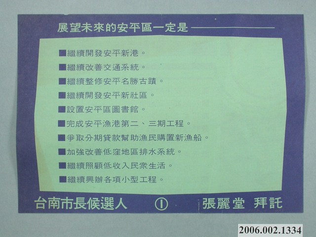 此物件為一選舉文宣,為1977年臺南市長選舉中,尋求連任的張麗堂的競選文宣。此文宣其中一面印有張麗堂的照片並列舉其臺南市長任內於東區的建設績效,亦附有競選業務相關聯絡資訊。另一面則印有對東區的未來政見。 此物件中提到1977年的臺南市第8屆市長選舉,由競選連任的中國國民黨籍的張麗堂與捲土重來的無黨籍候選人蘇南成競爭。張麗堂於任內有著「爭取興建安平新港」、「開拓臺南車站後站」的政績,但因時任建設局長的王欽誠涉嫌詐賭案而受到影響。蘇南成則與省議員黨外候選人蔡介雄結盟,以此拉攏群眾。此次選舉激烈,甚至出現斬雞頭發誓的「賭咒」事件。最後由蘇南成當選成為第8屆臺南市市長。
