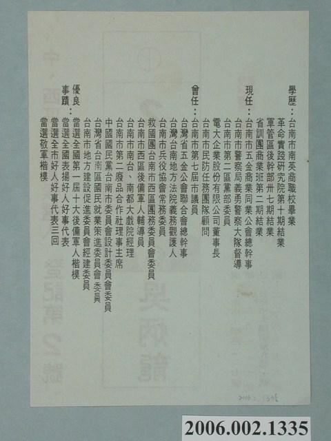 此物件為選舉宣傳單,標題為「中、西區市議員候選人 登記第2號吳炳龍 懇請惠賜神聖一票」,是吳炳龍為參選臺南市議員所印製的傳單,正面印有候選人相關資訊,背面條列其學經歷與優良事蹟。 吳炳龍為前臺南市議員,曾任臺南市第7、9、10屆市議員、臺南市五金工會總幹事、臺南選委會監察小組成員。 臺灣的縣市議員選舉始於日治時期,臺灣總督府在1935年6月發佈「市會議員及街庄協議會員選舉規程」,並於該年11月22日舉行全臺第一次市議員選舉。此次選舉之席次乃官選、民選各半,議員僅具議決權,不具提案、質詢等權責。中華民國政府接收臺灣後,臺灣行政長官公署於1945年公布「臺灣省各級民意機關成立方案」,並於翌年以間接選舉形式選出縣市參議員。1950年,政府依據「台灣省各縣市實施地方自治綱要」舉辦了第1屆民選縣市議員選舉,並定期實施改選至今。目前計有380位直轄市議員、532位縣(市)議員。