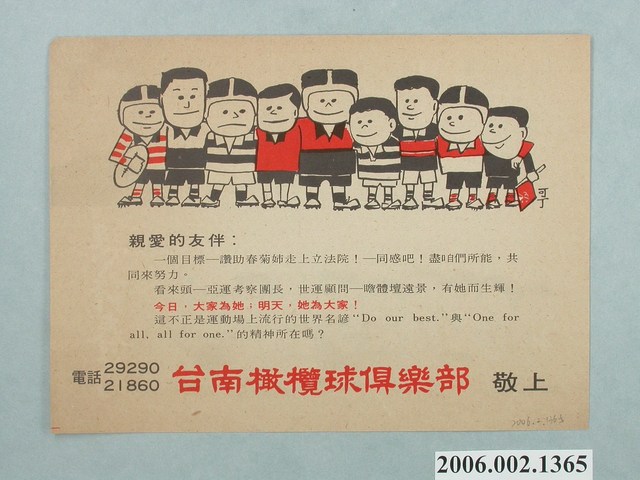 臺南橄欖球俱樂部印發第1屆增額立法委員候選人梁許春菊選舉宣傳單