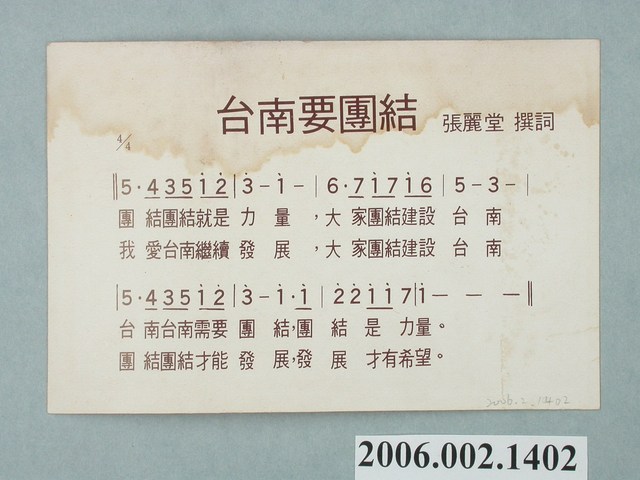 2006.002.1402 第8屆臺南市市長候選人張麗堂「臺南要團結」宣傳文宣