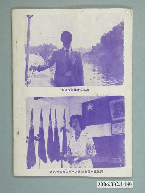 此物件為宣傳小冊,題名為《黃國展的耕耘――第六屆省議會黃國展政績》,編著者為林景南,發行單位為臺灣地方自治協會,封面及封底分別印有黃國展與黃范秀清伉儷圖像。 此物件的主要人物黃國展出身臺南市政治世家,曾任臺灣省議會第六、七屆議員。 臺灣省議會的前身為「臺灣省參議會」,成立於1946年,其成員係由各縣市參議員依照人口比例選出。在1947年「二二八事件」後,臺灣省參議會的代議功能受限,不久即式微。在1949年國民黨政府遷臺後,為了避免中央政府與臺灣省政府因設於同一所在地發生的各種問題,於是將省政府遷往南投並設立「臨時省議會」。1957年的第三屆臨時省議會選舉,是首度以直選形式進行的省議員選舉。1959年,「臨時省議會」改為「省議會」,此時的臺灣省議會成為臺灣最高民意機關,針對臺灣省政府的行政與政策進行監督及質詢。1997年「精省」案後,臺灣省議會更名為「臺灣省諮議會」,主要工作轉為歷史文獻之保存。(臺灣省諮議會,2014:4-37)