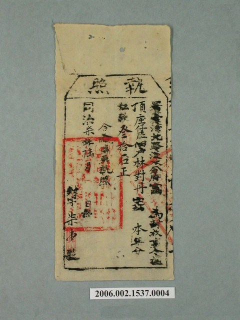 2006.002.1537.0004 同治7年臺灣北路淡水分府同知給頂庄仔庄佃戶林對丹執照