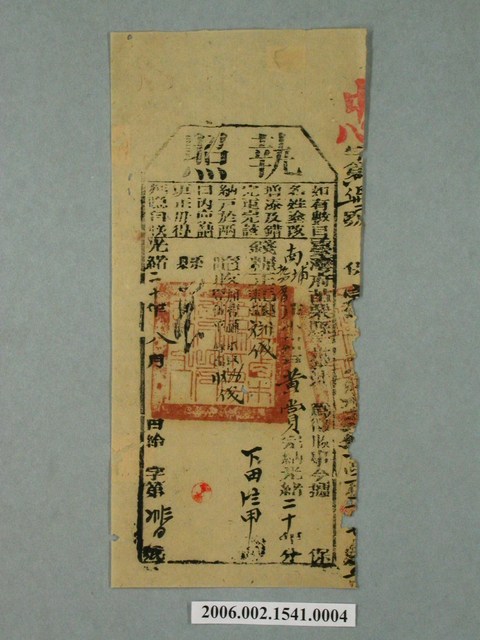 2006.002.1541.0004 光緒20年臺灣府苗栗縣官府給黃賞執照