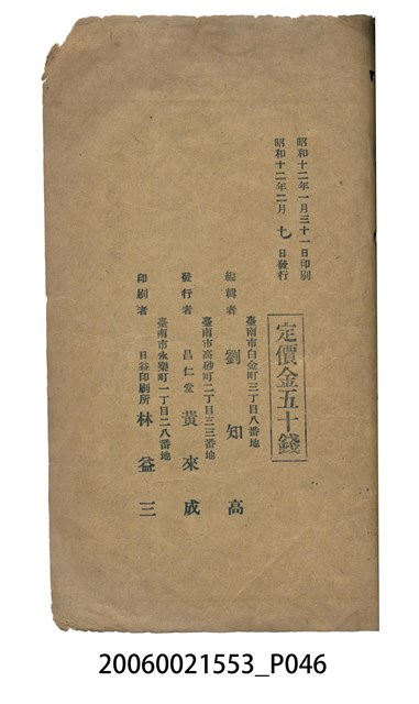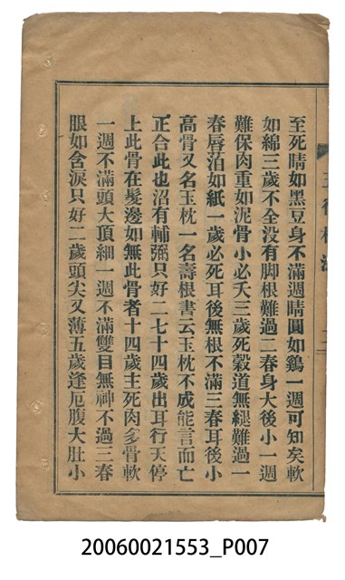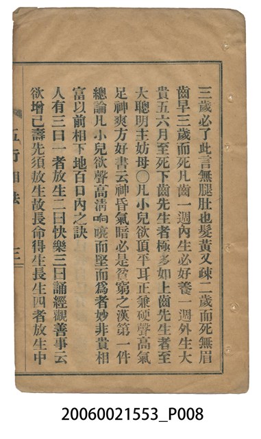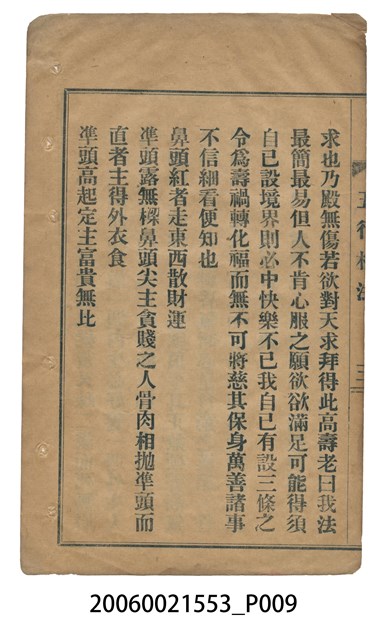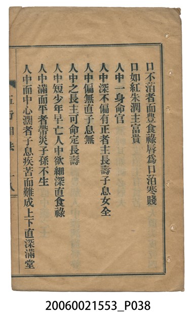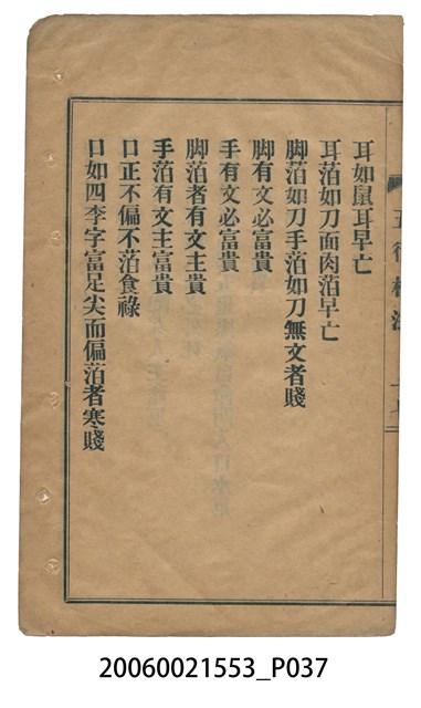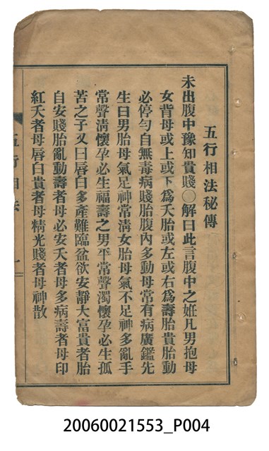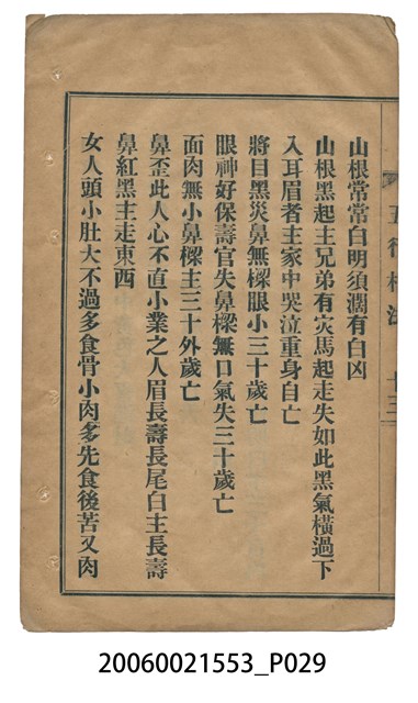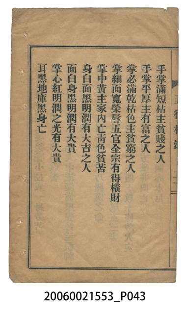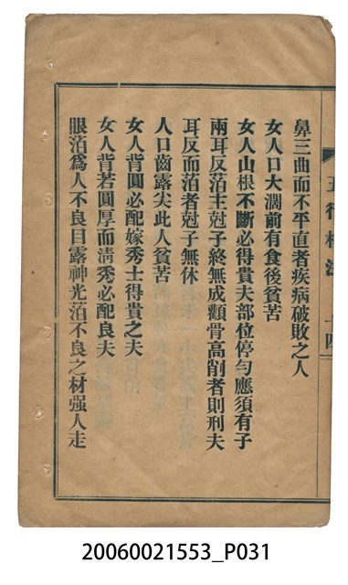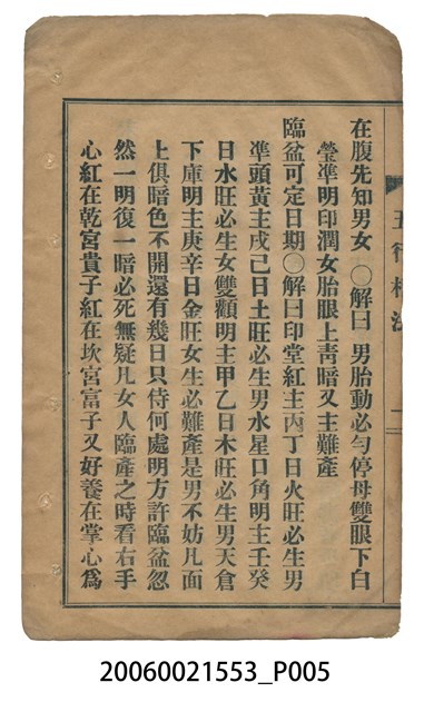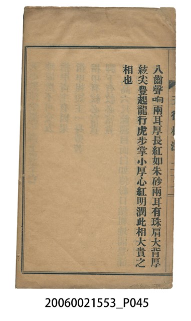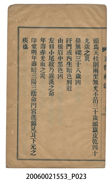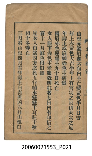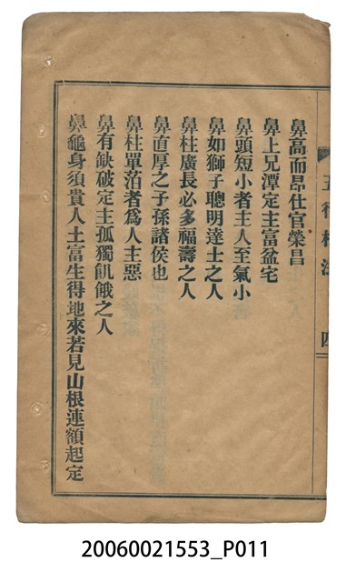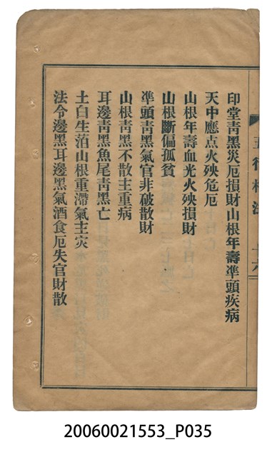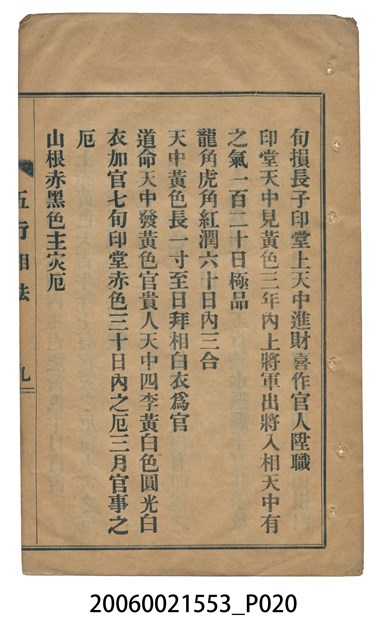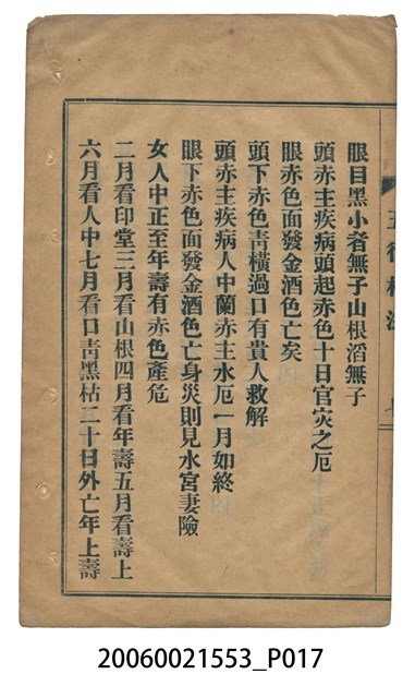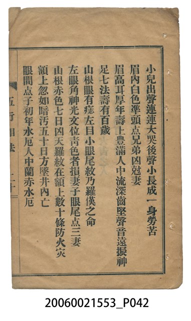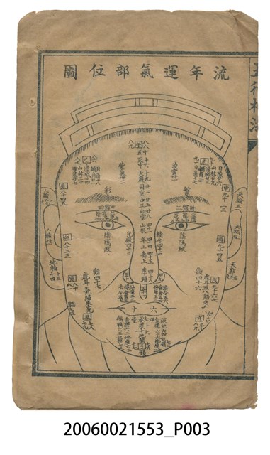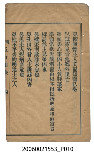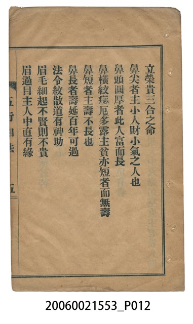 算法相法之書在漢人社會流通甚廣,本件《五行相法》為命相書的一種,四孔線裝,穿線已斷裂,書緣略有受損。封底有書寫記載車前、木通、扁白、大黃等藥草名稱。內容主要為面相及內種相法的說明,包括流年運氣圖、十三部位相法、五官六府相法、三才天干五星三停總論、拾貳個月氣色行運論。