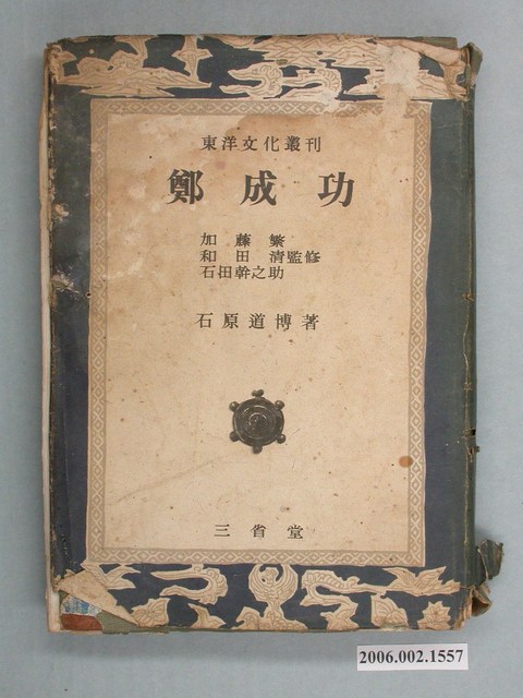 1.本件《鄭成功》的封面為藍色底,上、下緣帶有龍紋,中間白色底,橫書「東洋文化叢刊」、「鄭成功」、「加藤繁、和田清、石田幹之助藍修」、「石原道博著」、「三省堂」等字,書緣有多處破損,背面中間有藏書票,左下角有「停」、「¥200」、「規格B6」等字,保存完整。2.《國姓爺》是石原道博所撰,民國75年(1986)由東京的吉川弘文館所出版,此版本為三省堂所出版。