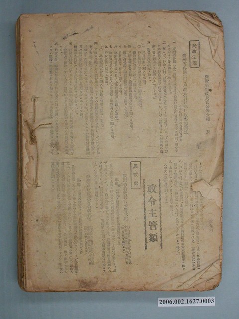 此為一紙質期刊,封面右側標示期刊名稱,左側為目錄。此為1946年5月8日發行之《臺灣省行政長官公署公報》夏字第17號。因封面破損,無法辨識目錄內容。 臺灣省行政長官公署於1945年9月1日在重慶成立,以陳儀為行政長官,是國民黨政府在戰後為了接收臺灣以及海南諸島所設置的特殊行政組織。長官公署內部派系林立、官員素質良莠不齊,因而在接收後,臺灣物價飆漲、物資稀缺、治安紊亂(游維真,2006:25-63)最終在1947年爆發「二二八事件」,事件之後,臺灣省行政長官公署改組為臺灣省政府。而行政長官陳儀於1948年被改任命為浙江省政府主席,但在1949年因匪諜案被判處死刑,於臺北槍決。