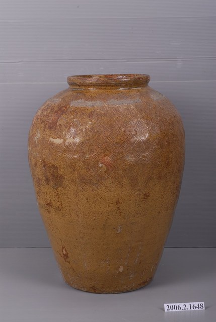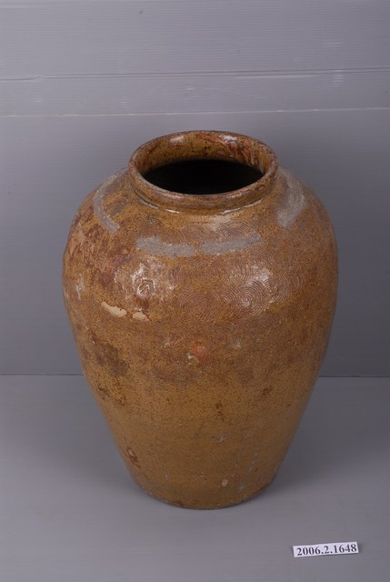 公賣局菸酒零售商酒甕,圓口,方唇,短頸內縮,圓肩,平底,全器最大寬度在肩腹交接處,向下斜收至底部。外器壁上半肩部至腹部上方1/2面積壓印「螺仔花」的同心圓紋飾,其中一片無花紋處壓印「公賣局菸酒零售商」字樣,下半部保持素面無紋,肩部有一圈因摞疊入窯燒造而留下的圈狀支燒痕。器身內外施黃褐色釉,釉厚薄不均,器口和外器壁近底部皆可見褐紅色條狀紋路。