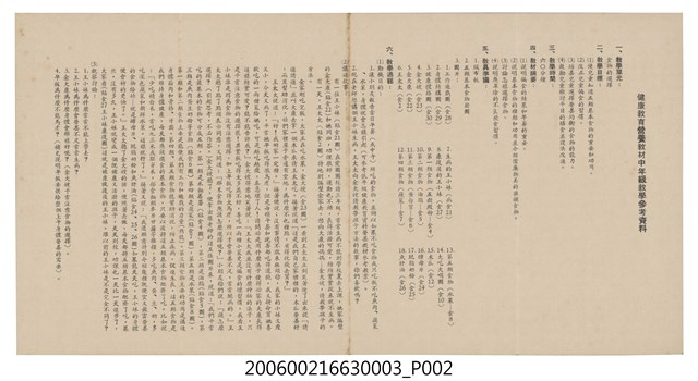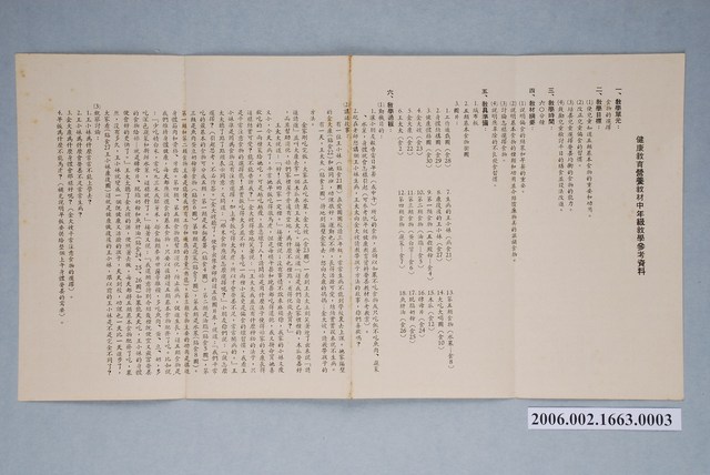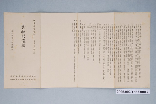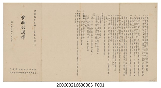 1.本物件為健康教育營養教材中年級教學參考資料,由臺灣省政府教育廳發行,臺灣省國民學校教師研習會編印。摺頁第一頁寫有「健康教育資料──營養教材(二)」、「食物的選擇」、「國民學校中年級適用」。內容包含教學單元、教學目標、教學時間、教材綱要、教具準備、各科聯絡、參考資料等課程規劃。2.戰後國民政府在臺灣設有行政長官公署教育處,1947年改制為臺灣省政府教育廳,1999年隨著時代變遷以及省政府業務以及組織的調整,省政府教育廳改制為教育部中部辦公室。臺灣省國民學校教師研習會創立於1956年,1959年改隸屬於臺灣省政府教育廳,1999年隨著教育廳改制,更名為教育部臺灣省國民教師研習會。3.臺灣的營養計畫始於1954年美援與農村復興聯合委員會的合作,隔年組織臺灣省政府教育廳營養教育委員會,並將食物營養講習放入工作計畫中。1957年教育廳會與農村復興聯合委員會(農委會之前身),選定屏東縣佳平、石門、北葉、三地及桃園縣介壽五所國民學校作爲「營養教育示範學校」,實施營養午餐制度。1964年省政府教育廳一方面編輯的兒童讀物,一方面也將營養與健康作為其推廣重點,並且依照低、中、高年級進行分類,推廣閱讀。