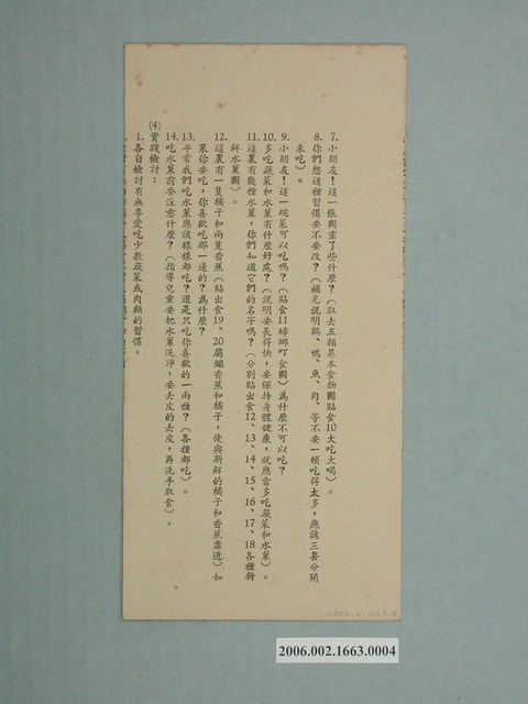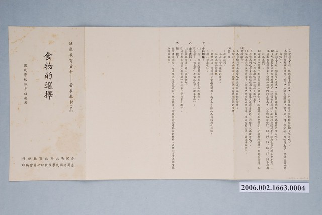 1.本物件為健康教育營養教材低年級教學參考資料,由臺灣省政府教育廳發行,臺灣省國民學校教師研習會編印。摺頁第一頁寫有「健康教育資料──營養教材(三)」、「食物的選擇」、「國民學校中年級適用」。內容包含教學單元、教學目標、教學時間、教材綱要、教具準備、各科聯絡、參考資料等課程規劃。2.戰後國民政府在臺灣設有行政長官公署教育處,1947年改制為臺灣省政府教育廳,1999年隨著時代變遷以及省政府業務以及組織的調整,省政府教育廳改制為教育部中部辦公室。臺灣省國民學校教師研習會創立於1956年,1959年改隸屬於臺灣省政府教育廳,1999年隨著教育廳改制,更名為教育部臺灣省國民教師研習會。3.臺灣的營養計畫始於1954年美援與農村復興聯合委員會的合作,隔年組織臺灣省政府教育廳營養教育委員會,並將食物營養講習放入工作計畫中。1957年教育廳會與農村復興聯合委員會(農委會之前身),選定屏東縣佳平、石門、北葉、三地及桃園縣介壽五所國民學校作爲「營養教育示範學校」,實施營養午餐制度。1964年省政府教育廳一方面編輯的兒童讀物,一方面也將營養與健康作為其推廣重點,並且依照低、中、高年級進行分類,推廣閱讀。