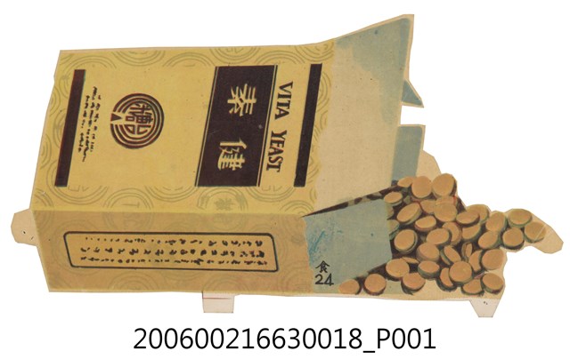 1.本物件為健康教育圖片酵母片,圖中有一黃色盒子上方寫有「健素」、「 VITA YEAST」,下方為臺糖標誌,整體為盒子到出健素糖之貌。健素糖的原料為酵母粉,因此該圖名稱被編者命名為酵母片,編號為食24,由臺灣省政府教育廳發行,臺灣省國民學校教師研習會編印。2.健素糖是臺糖公司於1957年開始生產之產品,由於1950年代的民生物資較微不足,因此將有蛋白質的酵母粉製成圓餅裹上糖衣,提供民眾作為一種營養補給的來源。時至2006年,臺糖公司遭媒體披露疑似採用進口飼料之酵母粉原料製作健素糖,爆發採購蛋白粉弊案,因而停產。3.戰後國民政府在臺灣設有行政長官公署教育處,1947年改制為臺灣省政府教育廳,1999年隨著時代變遷以及省政府業務以及組織的調整,省政府教育廳改制為教育部中部辦公室。4.臺灣的營養計畫始於1954年美援與農村復興聯合委員會的合作,隔年組織臺灣省政府教育廳營養教育委員會,並將食物營養講習放入工作計畫中。1957年教育廳會與農村復興聯合委員會(農委會之前身),選定屏東縣佳平、石門、北葉、三地及桃園縣介壽五所國民學校作爲「營養教育示範學校」,實施營養午餐制度。1964年省政府教育廳一方面編輯的兒童讀物,一方面也將營養與健康作為其推廣重點,並且依照低、中、高年級進行分類,推廣閱讀。