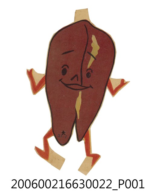 1.本物件為健康教育圖片牛肝,圖片為擬人化的牛肝,牛肝上有表情,同時也畫上其四肢,該圖編號為食31-1,應想透過圖片教材告訴學生牛肝富含維生素A,由臺灣省政府教育廳發行,臺灣省國民學校教師研習會編印。2.戰後國民政府在臺灣設有行政長官公署教育處,1947年改制為臺灣省政府教育廳,1999年隨著時代變遷以及省政府業務以及組織的調整,省政府教育廳改制為教育部中部辦公室。3.臺灣的營養計畫始於1954年美援與農村復興聯合委員會的合作,隔年組織臺灣省政府教育廳營養教育委員會,並將食物營養講習放入工作計畫中。1957年教育廳會與農村復興聯合委員會(農委會之前身),選定屏東縣佳平、石門、北葉、三地及桃園縣介壽五所國民學校作爲「營養教育示範學校」,實施營養午餐制度。1964年省政府教育廳一方面編輯的兒童讀物,一方面也將營養與健康作為其推廣重點,並且依照低、中、高年級進行分類,推廣閱讀。