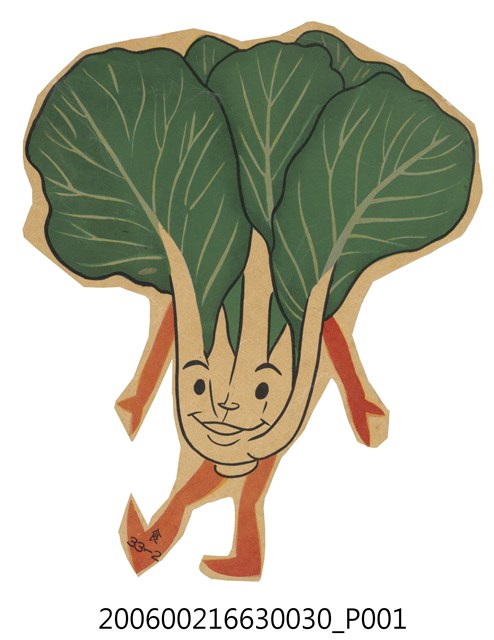 1.本物件為健康教育圖片小白菜,圖片為擬人化的小白菜,小白菜被畫上表情,同時也畫上其四肢,該圖編號為食33-2,應想透過圖片教材告訴學生小白菜富含維生素C,由臺灣省政府教育廳發行,臺灣省國民學校教師研習會編印。2.戰後國民政府在臺灣設有行政長官公署教育處,1947年改制為臺灣省政府教育廳,1999年隨著時代變遷以及省政府業務以及組織的調整,省政府教育廳改制為教育部中部辦公室。3.臺灣的營養計畫始於1954年美援與農村復興聯合委員會的合作,隔年組織臺灣省政府教育廳營養教育委員會,並將食物營養講習放入工作計畫中。1957年教育廳會與農村復興聯合委員會(農委會之前身),選定屏東縣佳平、石門、北葉、三地及桃園縣介壽五所國民學校作爲「營養教育示範學校」,實施營養午餐制度。1964年省政府教育廳一方面編輯的兒童讀物,一方面也將營養與健康作為其推廣重點,並且依照低、中、高年級進行分類,推廣閱讀。