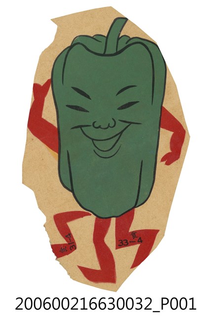 1.本物件為健康教育圖片青椒,圖片為擬人化的青椒,青椒被畫上表情,同時也畫上兩隻手,以及三隻腳,右腳上面有圖片編號食33-4,左腳的圖片編號則是食31-4,該圖應想透過教材告訴學生青椒富含維生素C,由臺灣省政府教育廳發行,臺灣省國民學校教師研習會編印。2.戰後國民政府在臺灣設有行政長官公署教育處,1947年改制為臺灣省政府教育廳,1999年隨著時代變遷以及省政府業務以及組織的調整,省政府教育廳改制為教育部中部辦公室。3.臺灣的營養計畫始於1954年美援與農村復興聯合委員會的合作,隔年組織臺灣省政府教育廳營養教育委員會,並將食物營養講習放入工作計畫中。1957年教育廳會與農村復興聯合委員會(農委會之前身),選定屏東縣佳平、石門、北葉、三地及桃園縣介壽五所國民學校作爲「營養教育示範學校」,實施營養午餐制度。1964年省政府教育廳一方面編輯的兒童讀物,一方面也將營養與健康作為其推廣重點,並且依照低、中、高年級進行分類,推廣閱讀。
