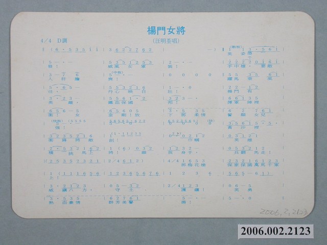 1.香港古裝連續劇《楊門女將》汪明荃明星照片,直式雙面,背面為橫式閱讀,正面為女主角汪明荃所飾演的穆桂英,背景為家徽旗幟,她一臉嚴肅英氣正氣凜然,戴著銀色頭冠,紅白色系的軍服,衣服有龍的圖騰,右下角則註記「穆桂英/汪明荃」,左下角則註記「星河607」,正面版面良好。背面則需橫式閱讀,以藍色註記《楊門女將》(汪明荃唱)的數字簡譜,底色為白但有點灰塵,整體影響不大。2. 香港連續劇《楊門女將》於1981年開播,香港電視廣播有限公司製作,王晶、譚嬣、曾淑娟、羅錦輝為監製,編導為杜琪峰, 汪明荃、馮寶寶、石修主演。