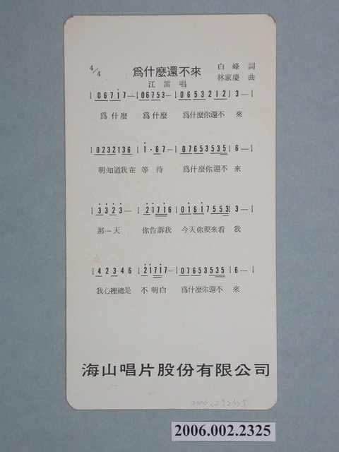 1.臺灣歌手江蕾在臺發行中文彩色照片書卡,直式雙面,上方版面背景全紅,她身穿綠色大衣外套,側身站著彎腰,一頭過肩捲髮臉部面對前方,臉龐則有兩個深深甜甜的酒窩,下方白色版面則放置1973年六七八月的月曆,由海山唱片發行,下方註記「海山唱片基本歌星,江蕾」。白色版面有些泛黃,紅色版面上方則有一些磨損,背面則是歌曲「為什麼還不來」數字簡譜,右邊版面註記為「白峰詞林家慶曲,江雷唱」,雷應該是誤植。下方註記「海山唱片股份有限公司」,角落邊緣則有些髒污。2.臺灣歌手江蕾活躍於1973至1978年,此張專輯為1973年加入海山唱片所發行的專輯《煙雨斜陽》中的一曲,與《在水一方》 均受到廣大歌迷的喜歡。