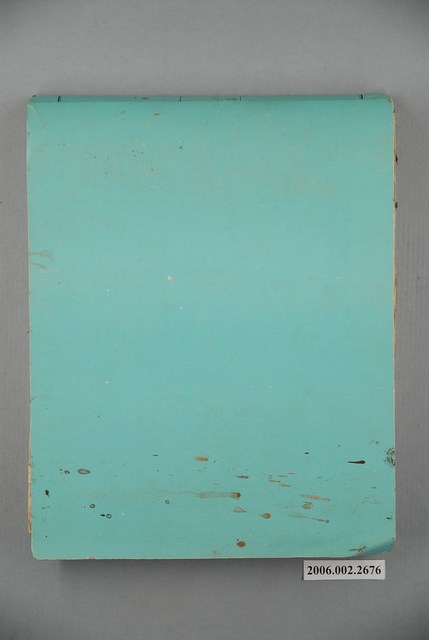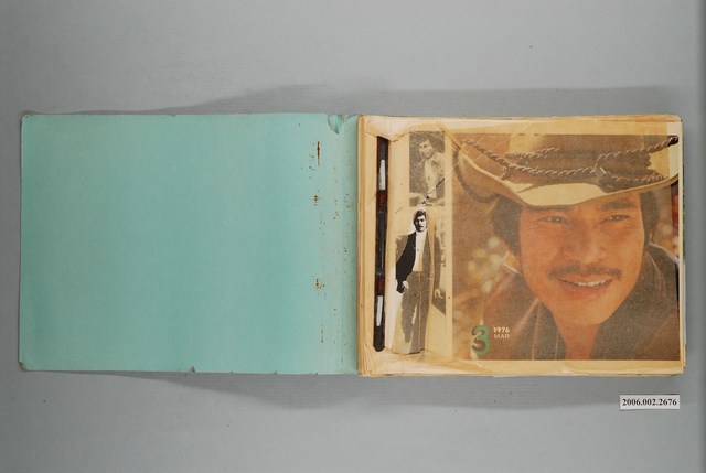 1. 私人剪貼簿,封面為淡藍色紙質,為活頁夾裝訂形式,封面上有「光華牌紙製品」字樣,封底亦為淡藍色,首頁可見活頁裝訂夾生鏽的痕跡。首頁有甄珍三張照片,第一張為劇照,其餘兩張為相同裝扮與髮型的明星沙龍照。2. 剪貼簿其他資訊不詳。