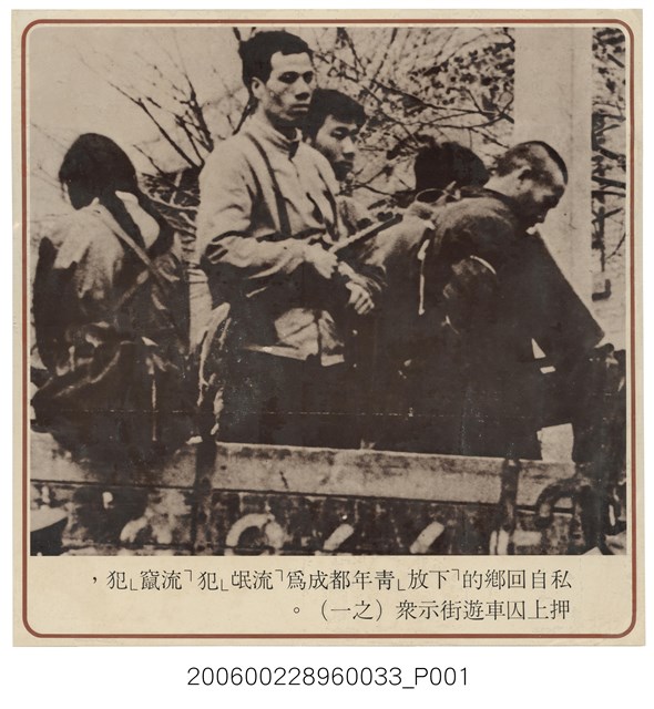 中國大陸災胞救濟總會印行《中國大陸共匪暴行》〈「流氓、流竄」犯押上囚車遊街示眾(之一)〉文宣