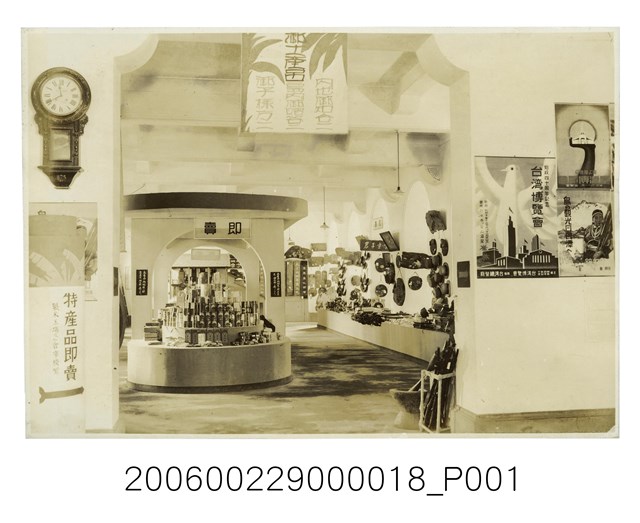 1.本件為《山岳館》相片集之第18張照片,內容為山岳館1樓南側的「即賣品陳列臺」展售區,中央特別設計為船型陳列臺,主要陳列販售臺中州的地方特產,包括茶葉、鳳眼糕、蜜餞、漆器、大甲帽、及原住民工藝品等土產品。