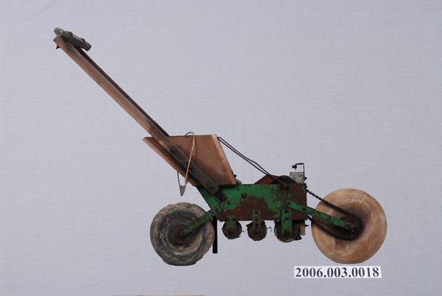 本物件為手推花生播種機,其後方為金屬扶手,連接而下有一個金屬儲種箱,可將花生放進儲種箱,有一個後輪輔助播種機向前推行,前端木質圓盤則有翻土功能。以往種植花生全是由人力手工點播,要刨坑,放種,復土等步驟,花生播種機則能節省工序,方便許多。現今臺灣花生栽植規模最大位於雲林縣之元長鄉、土庫鎮等地。