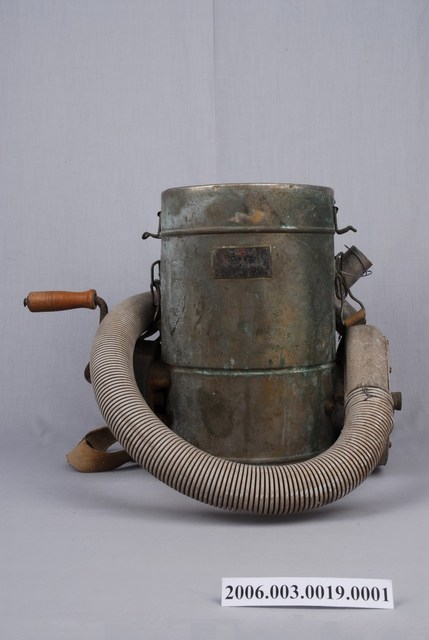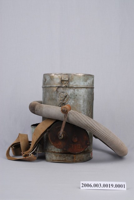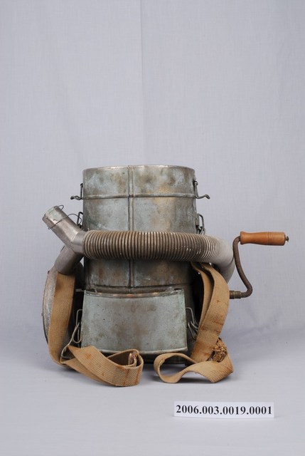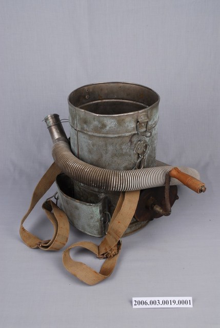 1. 本物件為農復會光復初期消除霍亂手搖DDT噴灑器主體。噴灑器主體為一有蓋桶子,桶子外圍銲有一鐵皮,與桶面形成一個空間。桶子底部連接一條水管,水管噴口有兩端,呈Y字型。桶子上安裝有轉軸,轉軸上有震旦字樣。桶子上扣有背帶。 2. 二次大戰後,國民政府為復興農村,於西元1948年10月1日,依據中美兩國所簽經濟合作協定,在南京成立「中國農村復興聯合委員會」(簡稱農復會),協助中國戰後農村復興工作。西元1949年農復會亦隨政府來臺,進行臺灣農村的復興。西元1978年9月15日,美方終止雙方合作並停派農復會美