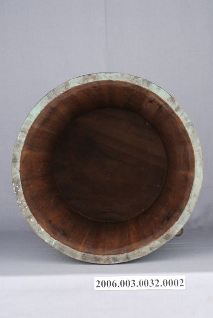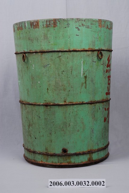 1.本件桶身為集賢號紅豆冰桶之部件2,呈長41公分,寬40.5公分,高55公分。桶身以長板形木材圍繞成圈,外型呈現圓口直桶狀,再以粗鐵圈作箍圈分別於器身上作四道固定,第一道箍圈周圍帶有等距4個鐵製圓環,底緣一側則帶有圓形透孔,應作排水口之用。桶身表面以淺白綠色油漆塗佈,並於身側中段處以紅色漆料寫下紅豆冰字樣,為該桶裝盛之冰品項目。2.本件紅豆冰桶為集賢號商家所使用的營業用裝盛器,依據桶身上之紅豆冰字樣,應為傳統的冰品甜食店。
