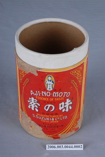 本件紙筒罐身為味之素本舖株式會社鈴木商店製味之素紙筒罐之部件2,呈長10.5公分,寬10.6公分,高15.6公分之圓筒身,通身以紙質製作,內層以卡其色厚紙板作內襯,外層另以彩色印刷之紙張包裹。罐身上段口緣略為內縮,與罐蓋採套合式開闔。罐身表面以紅色與黃色為主視覺色,正面以單支麥稈於左右成圓框,其4端角作3枝葉卷紋。框內上端為味之素商標,於直式橢圓形框內,身穿印有味の素字樣的圍裙之婦女圖像。中段處以白字橫書「味の素」與其羅馬拼音。下端印有「宮內省御用達」、「味の素本舖株式會社鈴木商店」字樣。背面則為倉品特色與說明之英譯。左右兩側以黃色麥稈成長方形框,內印商品說明與商品特色文字。