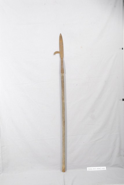 本件為梧棲大庄宋江陣鉤鐮槍,又稱拐馬鉤、鉤仔,宋江陣操演的兵器之一,造型是槍頭旁附帶倒鉤的長槍,作用為砍馬腿和鉤敵人武器。金屬鍛造,表面氧化佈滿鏽斑,刀柄為長木柄。宋江陣屬於民俗陣頭之一,源自民間的自衛組織,組成人數主要為36名,操演陣式的兵器有雙斧、雙刀、雙眼、雙棍、雙鞭、叉仔、耙、躂刀、鉤仔、大刀等等。