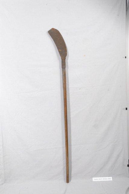 本件為梧棲大庄宋江陣劈刀,宋江陣操演的兵器之一,金屬鍛造,刀身弧形,刀背較厚,表面氧化佈滿鏽斑,刀柄為長木柄。宋江陣屬於民俗陣頭之一,源自民間的自衛組織,組成人數主要為36名,操演陣式的兵器有雙斧、雙刀、雙眼、雙棍、雙鞭、叉仔、耙、躂刀、鉤仔、大刀等等。