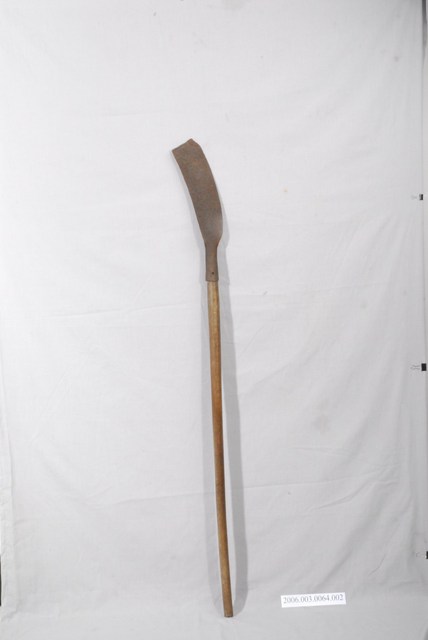 本件為梧棲大庄宋江陣劈刀,宋江陣操演的兵器之一,金屬鍛造,刀身弧形,刀背較厚,表面氧化佈滿鏽斑,刀柄為長木柄。宋江陣屬於民俗陣頭之一,源自民間的自衛組織,組成人數主要為36名,操演陣式的兵器有雙斧、雙刀、雙眼、雙棍、雙鞭、叉仔、耙、躂刀、鉤仔、大刀等等。