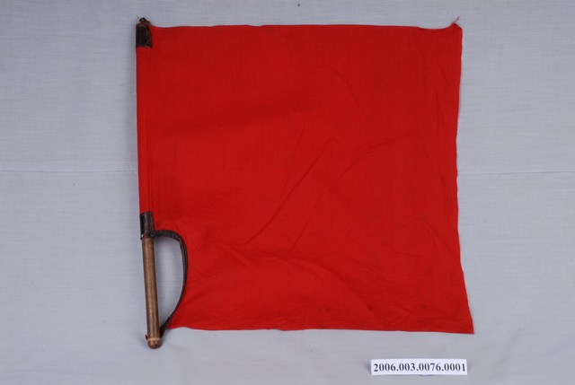 本物件為紅信號旗,材質為布與木頭,形狀呈方形,顏色為紅色,木棍固定於紅布1側。