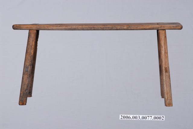 1.本物件為木製打草繩器具的板架,外型為1張長凳,椅面鑿有1個方形孔洞。打草繩時,將T字型絞盤立起,安裝在長凳孔洞上使用。