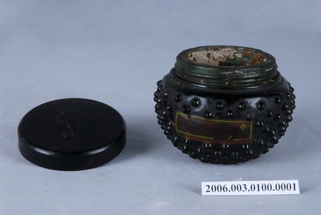 本文物為中山太陽堂化妝品盒,盒身為黑色,表面有多顆半圓形凸起物,寫有「ELBORNES」、「CREAM」等字樣。盒蓋上有一名女性側臉圖案。1903年中山太陽堂創辦人中山太一在神戶做國外商品與化妝品的進出口商創業。在創業3年後轉向聘請外國技師、成立化學研究所,以及近代化化妝品工廠,並自行開發生產化妝產品。女性臉上的妝扮為其對特定生活之想像,相對地女性之美也時常受限於社會傳統價值觀,妝扮女性的化妝品及其附屬產品,則體現了社會審美觀和科技的變動。