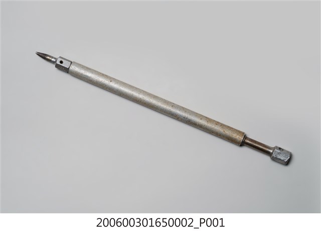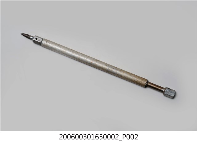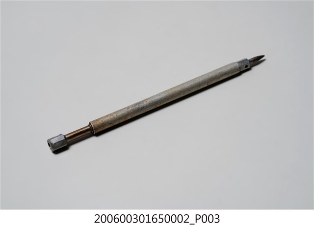 本件為架軸,材質金屬,已有氧化鏽斑,作用為插入底座,支撐起地鐘。地鐘是佛教念佛的輔助法器之一,念佛時人盤坐於地上,地鐘放在人前地面上,手執地鐘槌敲擊,誦念佛號或經文,通常搭配小型木魚持誦。