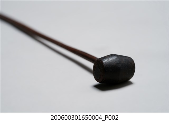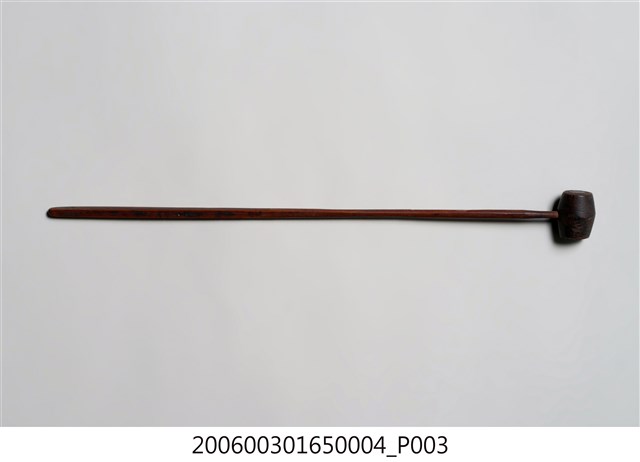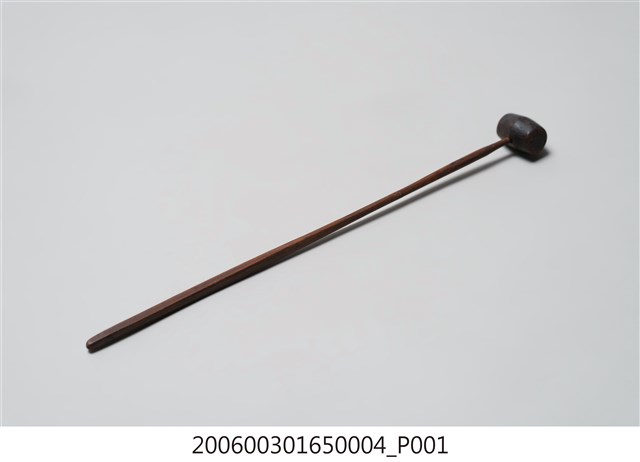 本件為地鐘槌,材質木頭,用來敲擊地鐘發出聲音。地鐘是佛教念佛的輔助法器之一,念佛時人盤坐於地上,地鐘放在人前地面上,手執地鐘槌敲擊,誦念佛號或經文,通常搭配小型木魚持誦。